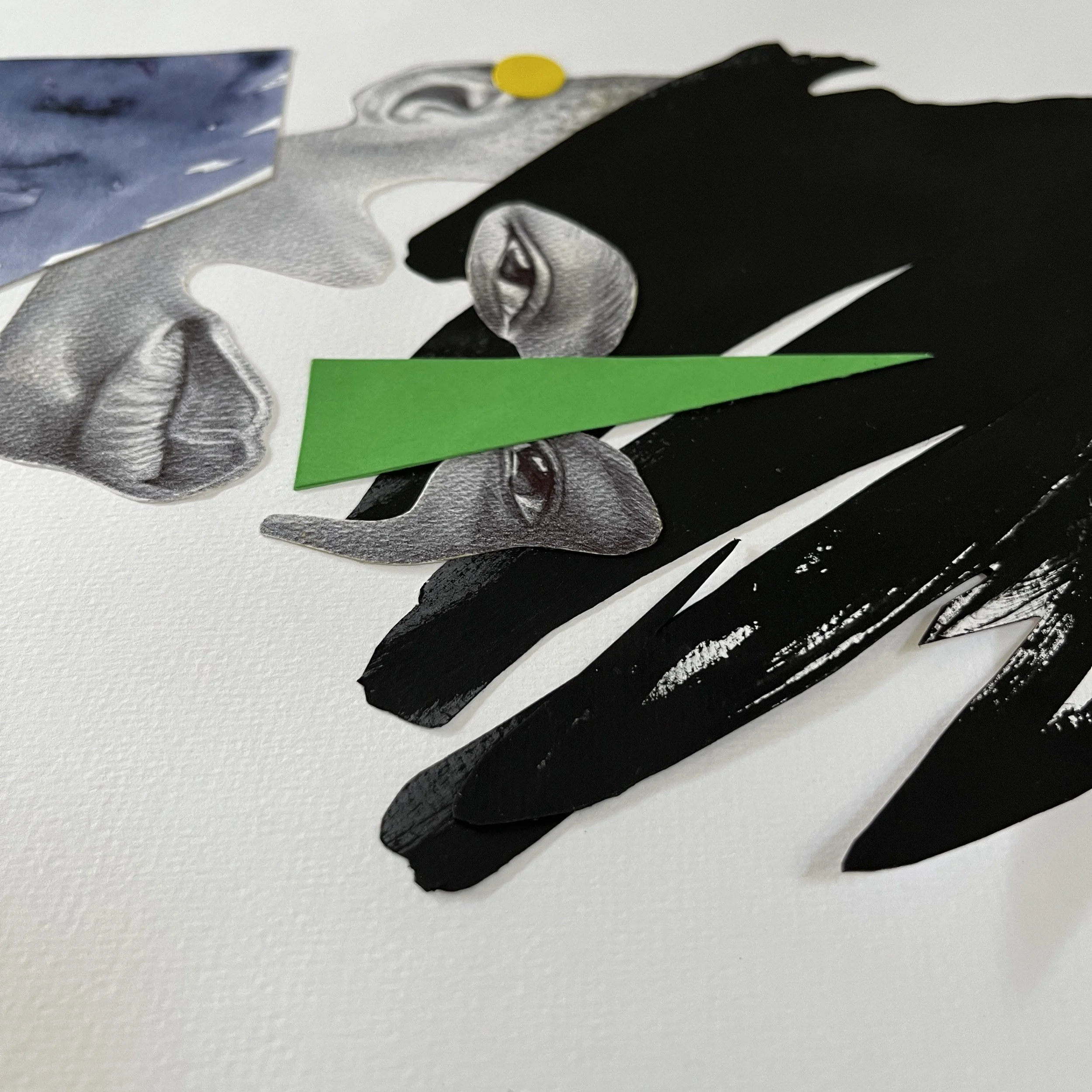 Afro Collage 1 is an original drawing that deconstructs the portrait of a black man, boldly blending a diversity of mediums and forms. This work captures the strength of a contemporary man, deeply rooted in his time, with a rich, sensitive and complex inner world. This unique drawing is part of the series entitled “Afro Collage”. This work is sold unframed.